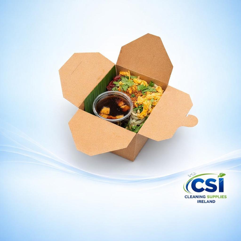Constructed from premium brown kraft paper, these 1.4L takeaway food containers offer a high-end, eco-friendly presentation that resonates with the Irish market. The sturdy folding lock lid provides a secure seal for transport, while the large surface area makes it easy for customers to eat directly from the container.