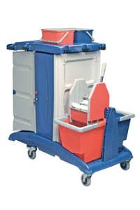 Cleaning Supplies Janitorial Cart System Bag holding system Central cupboard (access either side) Lockable, 2 keys. 2 x 6 litre buckets, 2 x 15 litre mop buckets. Now supplied with MAX450 wringer. Trolley lid with transparent document holder H: 106cm (42″) L: 84cm (33″) D: 58cm (23″)