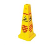 A bright yellow, four-sided cone with universal wet floor graphic and ‘Caution’ printed in English, German, French, Spanish and Dutch on all sides.